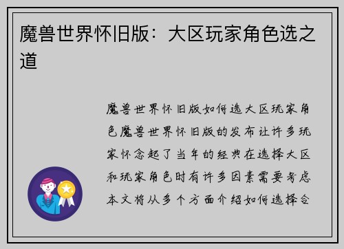 魔兽世界怀旧版:大区玩家角色选之道